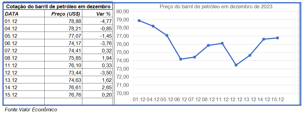 Preço do barril de petróleo subiu 0,20% nesta sexta feira em relação ao dia anterior. A commodity foi cotada a US$76,76 o barril no fechamento do mercado com desvalorização de 2,69% em dezembro.